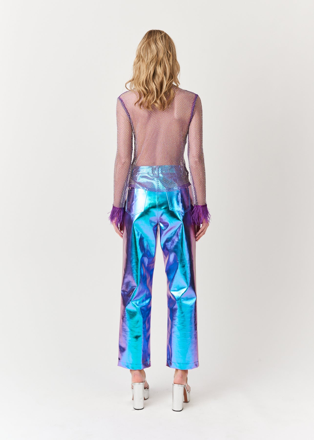 A premium netted mesh top with beautiful blue coloured rhinestone jewels. A long sleeve fitted silhouette with no stretch and faux feather trim on each cuff for maximum effect!